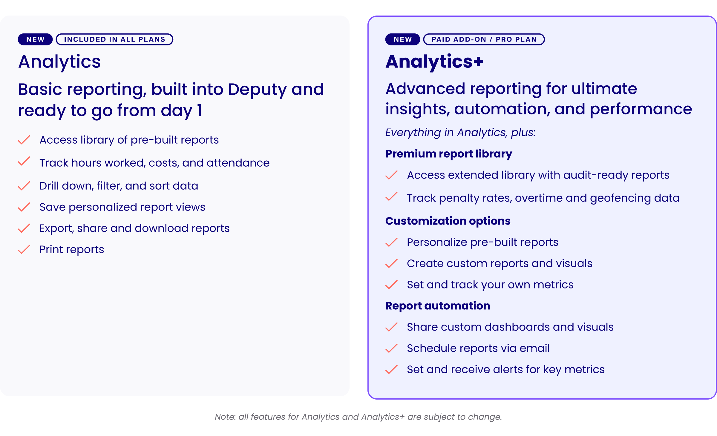Analytics+ is a new add-on subscription that gives you access to Deputy’s advanced reporting and analytics tool, designed for managers who need deeper insights, greater customization, and more control over their business data. This optional add-on subscription is entirely separate from your current Deputy subscription.