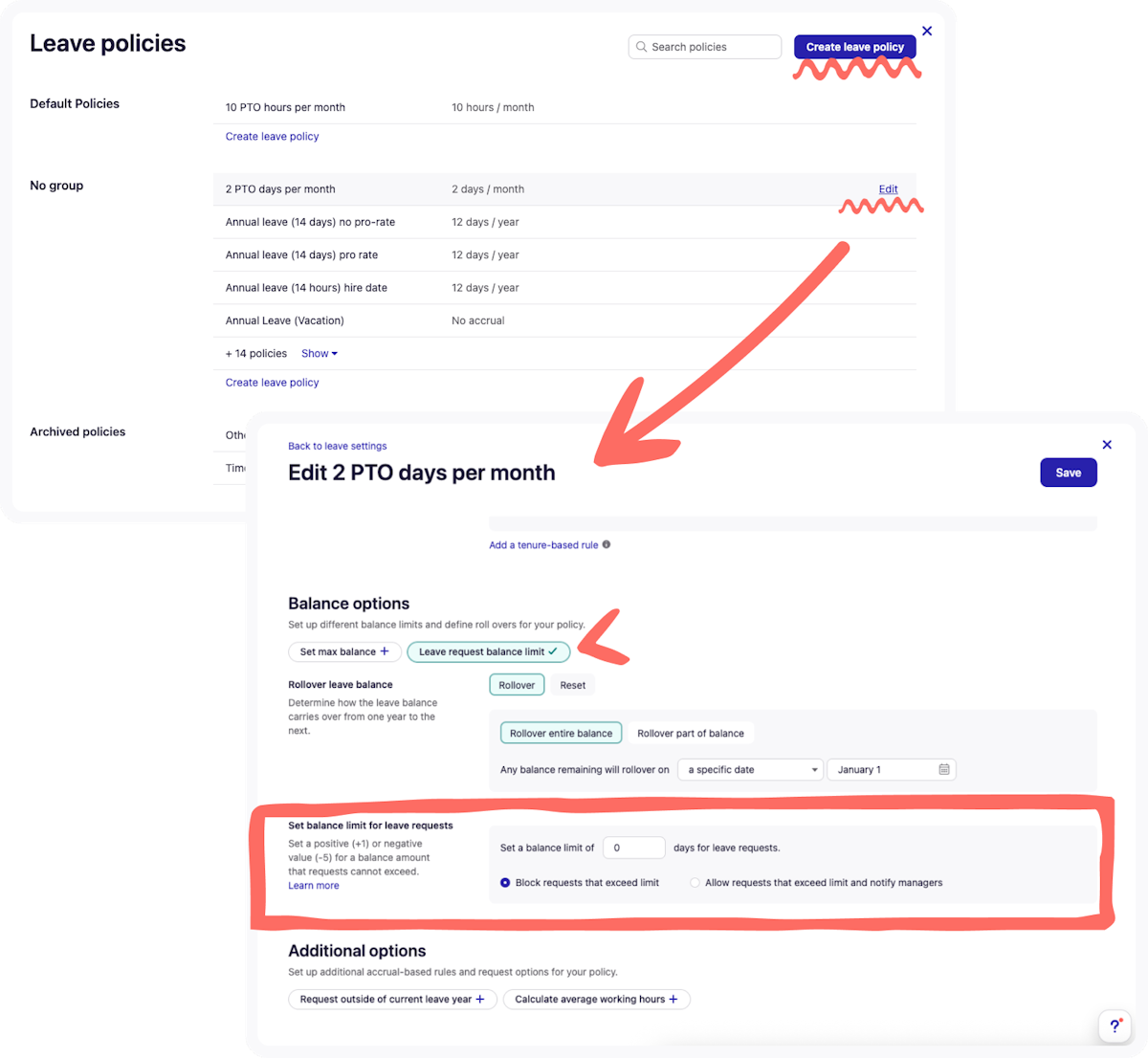 Within our Leave policy builder, you can now set positive or negative balance limits, to best reflect the policy you have in place across your business (for example, allowing employees to go into 2 days of negative leave).Set approval guardrails that make sense